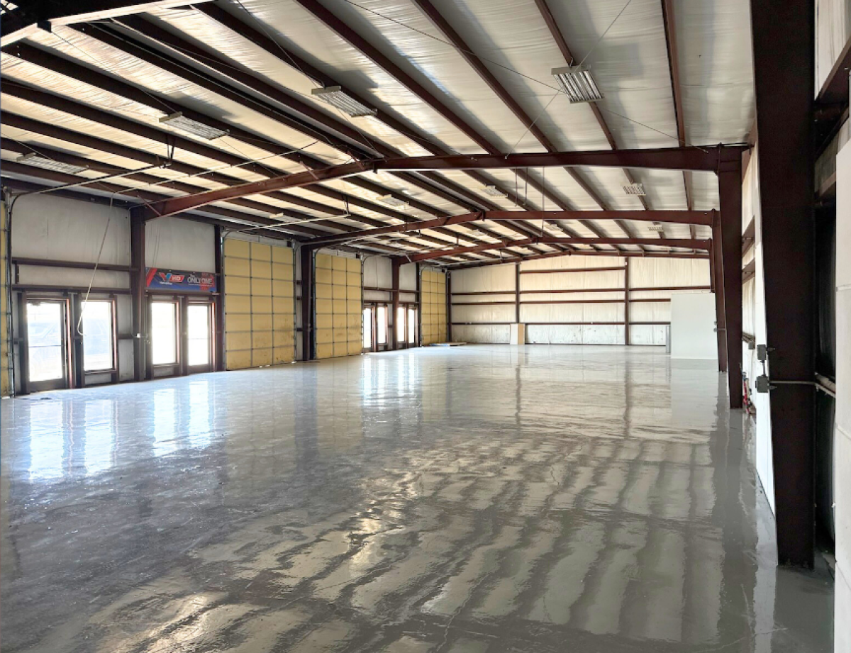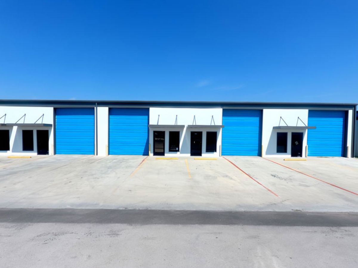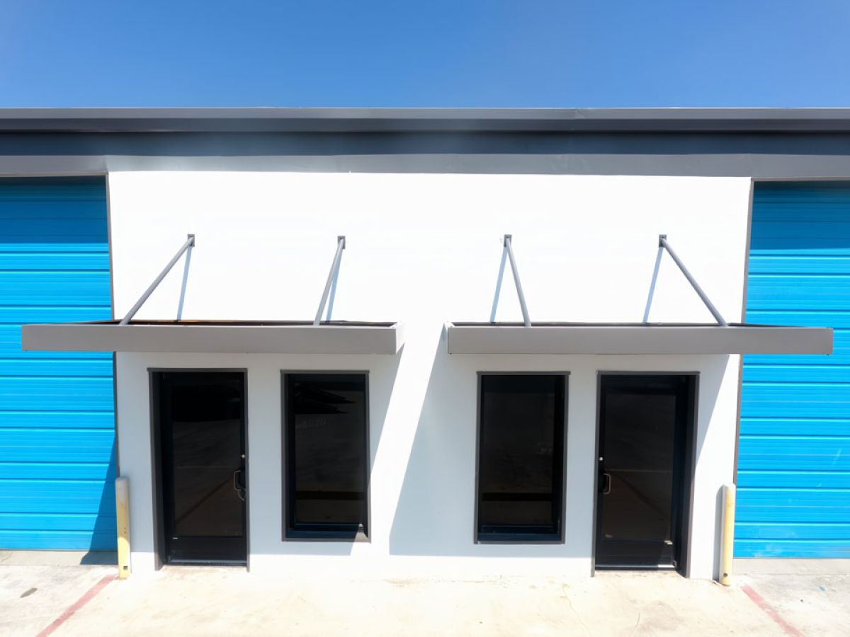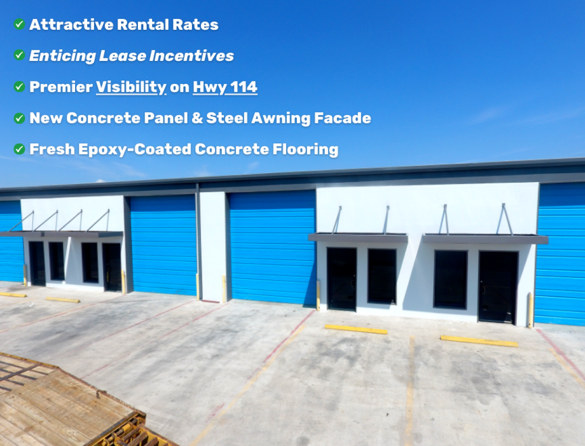 The nine buildings, consisting of 68,350 sq ft flex/industrial park space for lease, sport eye-catching modern facades, units ranging from 2,500-8,750 sq ft, and 12′ x 14′ grade-level loading. Building 1 front-facing Highway 114 has new epoxy-coated concrete floors and a newly-installed concrete-panel and steel awning facade, the first phase of new facade improvements across the industrial park.